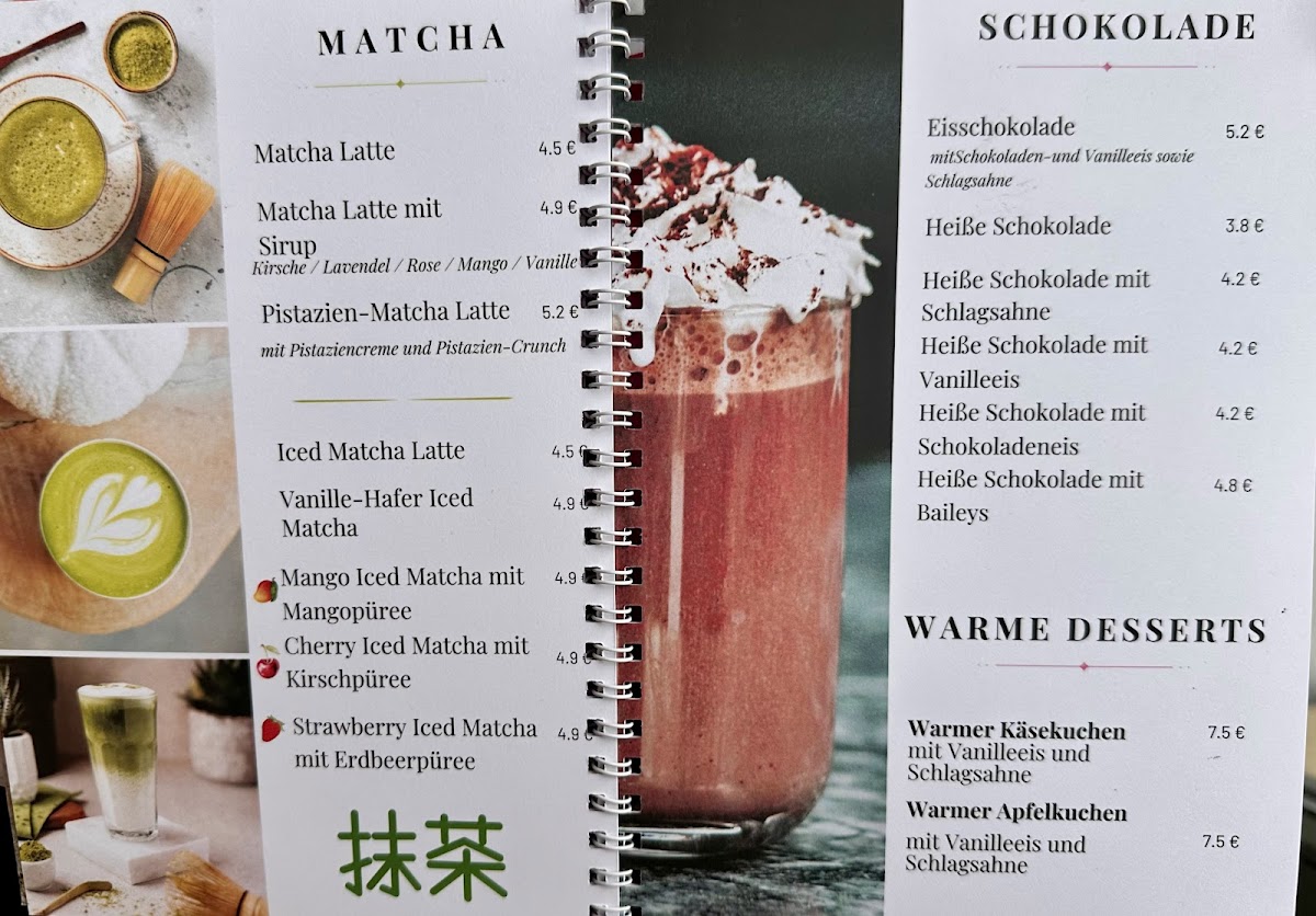 - Matcha Drinks: A selection of Matcha-based beverages is available, including hot or cold Matcha Latte (€4.50), flavored options like Matcha Latte with cherry (€4.80), and iced versions with vanilla or mango flavors, served with oat milk (€4.80 each).
